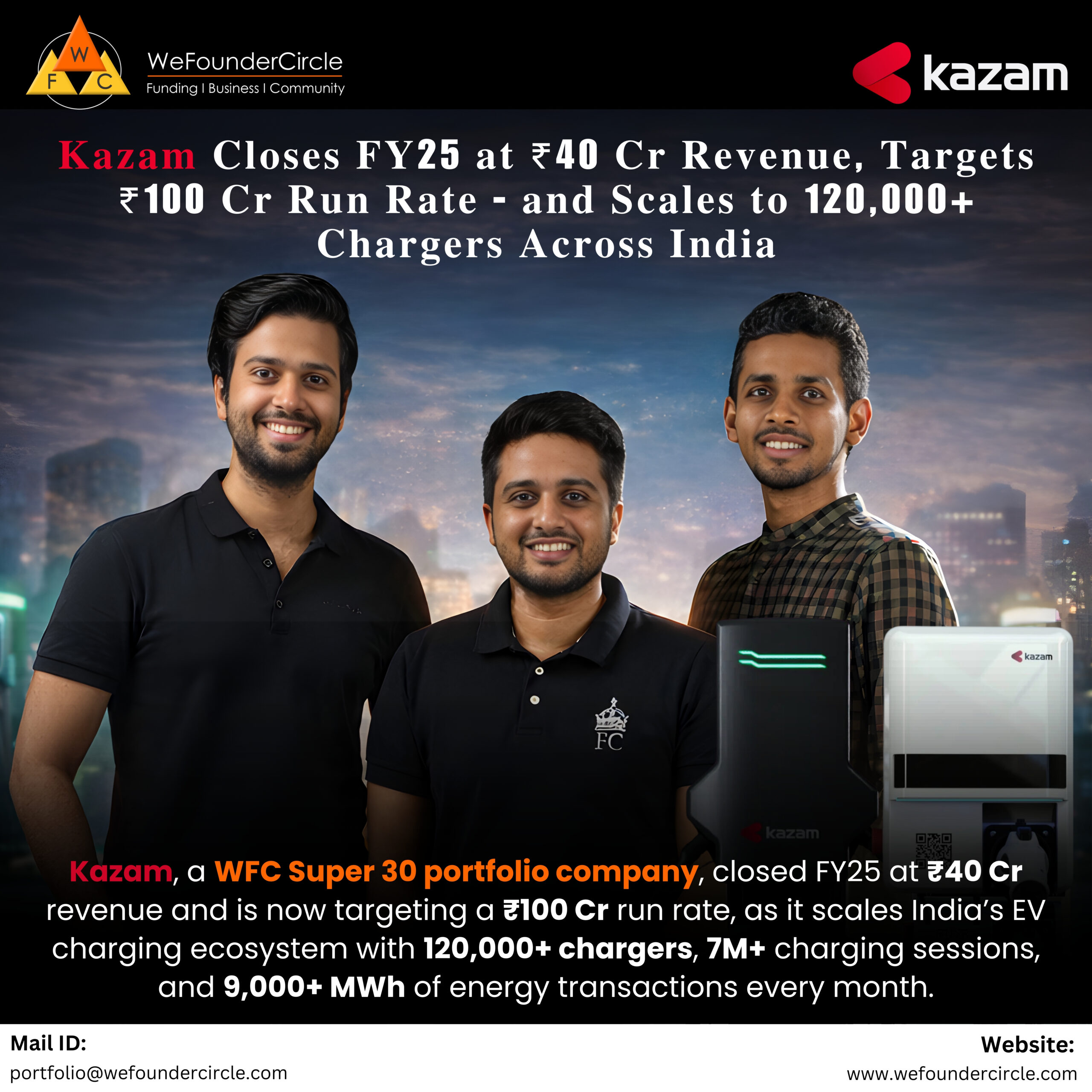 Kazam closed FY25 at ₹40 Cr revenue, scaling to 120,000+ chargers and targeting ₹100 Cr run rate.