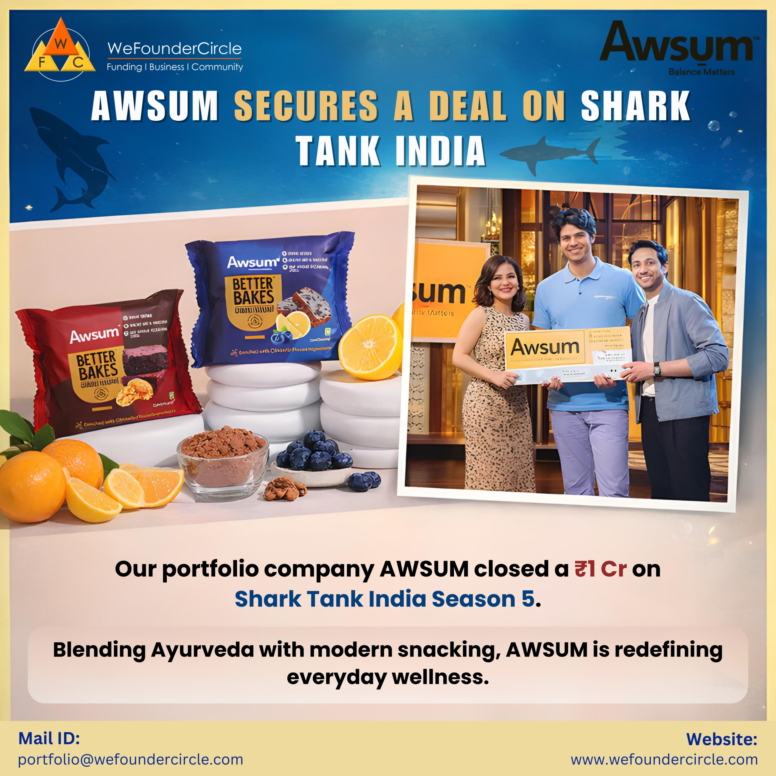 AWSUM secured ₹1 crore deal on Shark Tank India, accelerating growth of better-for-you functional food products nationwide.